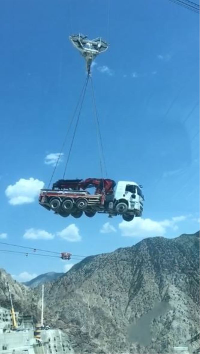 Barajın gövde beton çalışmaları sırasında iş makinelerini vadi içinde taşımak için karşıdan karşıya kablolu vinç sistemi kullanılıyor. Tonlarca ağırlığındaki iş makinelerini metrelerce yükseklikten taşıyan vinç operatörü, bu kez 30 tonluk iş makinesini taşıdı. Taşıma sırasında meydana gelen tonlarca ağırlıktaki iş makinesinin sallanması ilginç görüntülerin yaşanmasına neden oldu.