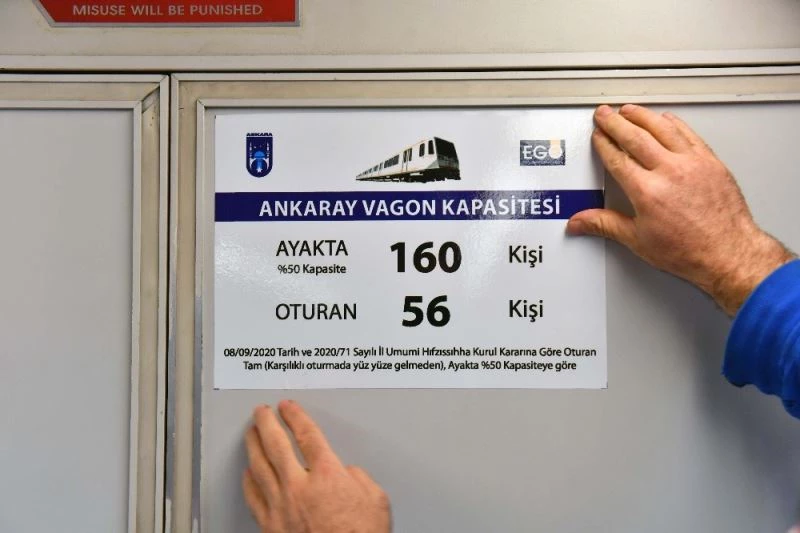 Ankara Büyükşehir Belediyesi, Covid-19 vakalarının artmasını önlemek amacıyla toplu taşıma araçlarında yolcu kapasitesinin yeniden düzenlenmesi üzerine ek önlemler alıyor. EGO Genel Müdürlüğü, Başkent’te hizmet veren EGO otobüsleri başta olmak üzere ANKARAY ve Metro vagonlarına yolcu taşıma kapasitelerine ilişkin bilgilendirme etiketleri yapıştırmaya başladı.