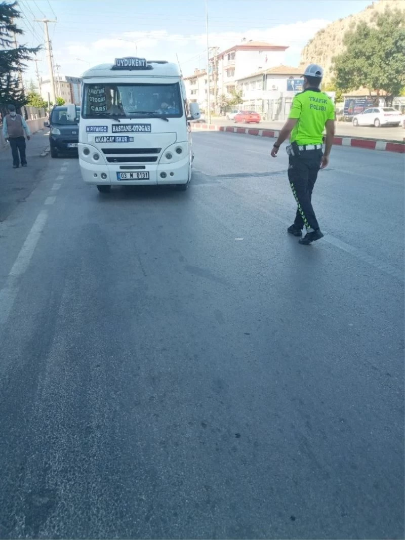 İçişleri Bakanlığının 81 il valiliğine gönderdiği genelge kapsamında Afyonkarahisar’ın 5 noktasında şehir içi yolcu taşımacılığı yapan dolmuş ve halk otobüsleri denetlendi. Denetlemelerde durdurulan dolmuşlarda ayakta yolcu olup olmadığı, yolcuların maske takıp takmadıkları ve dezenfekte olup olmadığı kontrol edildi. Çok sayıda aracın denetlendiği uygulamada dolmuşçu esnafı ve halk otobüsleri şoförlerinin kurallara genel anlamda uydukları gözlenirken, ayakta yolcu alma kuralını ihlal eden 5 dolmuş şoförüne ise 108’er TL para cezası kesildi.