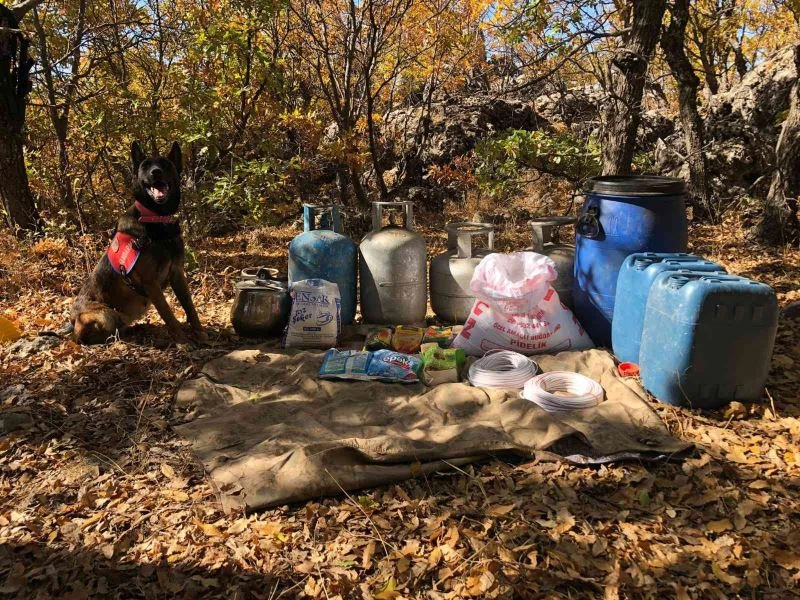 Toprağın altından 4 adet 12 kiloluk mutfak tüpü, 1 adet 2.5 kiloluk piknik tüpü, 1 adet jelikan bidon, 200 metre kablo, 50 kilo gübre ile yaşam malzemesi ele geçirildi.