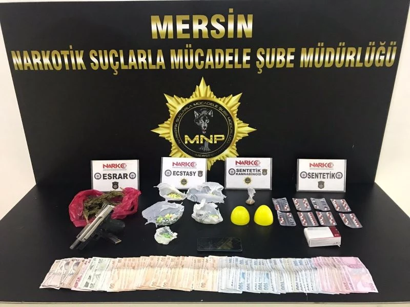 İl Emniyet Müdürlüğünden yapılan açıklamaya göre, Narkotik Suçlarla Mücadele Şube Müdürlüğü ekipleri, kentin farklı mahallelerinde ’torbacı’ diye tabir edilen uyuşturucu satıcılarına yönelik çalışma başlattı. Uzun süren teknik ve fiziki takibin ardından şüphelilerin yakalanmasına yönelik narkotik, özel harekat, ilçe emniyet müdürlükleri ile narkotik köpeklerinin de desteğiyle şafak operasyonu gerçekleştirildi. Mersin, Tarsus ve Antalya’nın Alanya ilçesinde belirlenen adreslere gerçekleştirilen operasyonlarda 7 kişi gözaltına alındı. Adreslerde yapılan aramalarda 260 adet extacy, 106 gram sentetik kannobinoid, 50 gram esrar, 80 sentetik ecza ile 1 ruhsatsız tabanca, şarjörü ve 4 MKE yapımı fişek ele geçirildi.