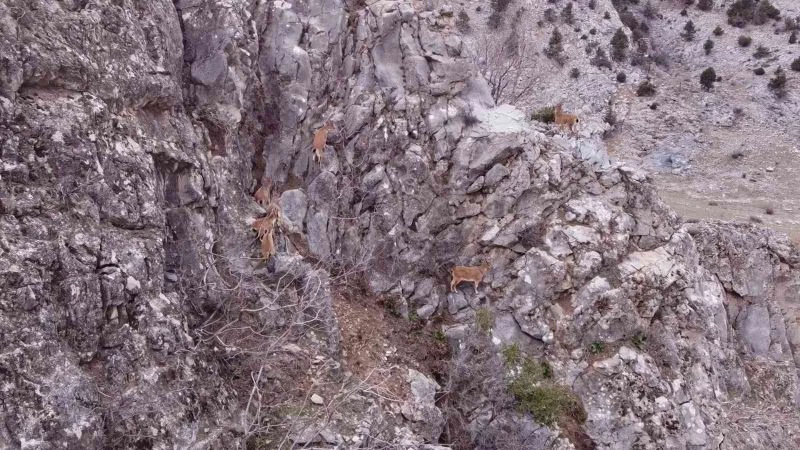 Adana’nın Pozantı ilçesindeki Toros Dağları’nın kayalıklarında dolaşan dağ keçisi sürüsü dron ile görüntülendi.