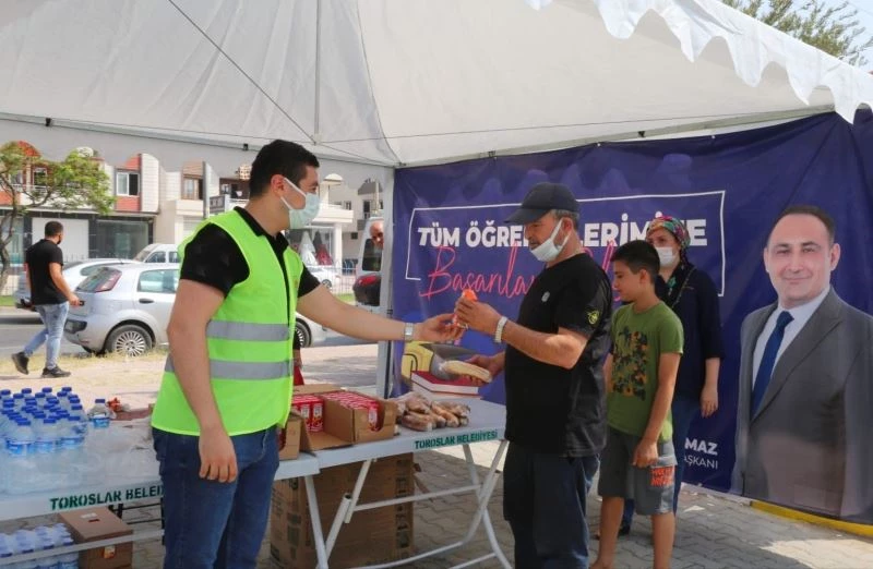 Mersin’in merkez ilçe Toroslar Belediyesince, sınav merkezlerinin önüne kurulan stantlarda, hem öğrencilere hem de evlatlarını bekleyen ailelere sınav süresince ikramda bulunuldu.