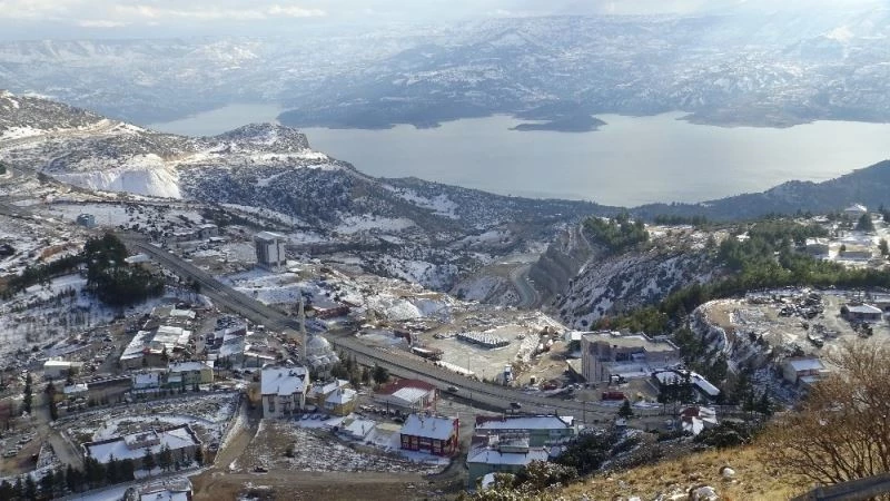 Baraj gölünü çevreleyen Toros dağları ve ilçe merkezinin kar manzaraları havadan yapılan çekimlerde kartpostallık görüntü oluşturdu.