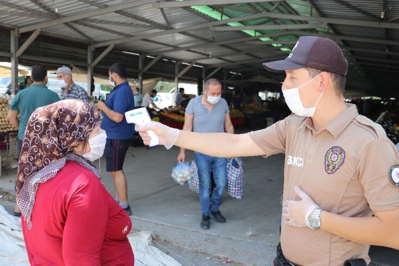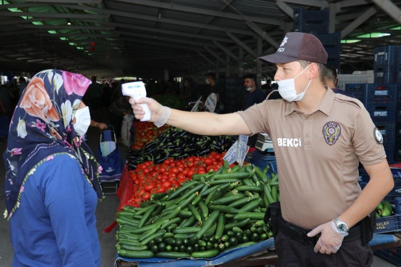 Zabıta Müdürlüğü ekipleri, korona virüs (Covid-19) tedbirleri kapsamında, temizlik ve hijyenin yanı sıra maske, eldiven kullanımı, sosyal mesafe ve el ile ürün seçilmemesine yönelik esnafa ve vatandaşlara uyarılarda bulundu. Söz konusu denetimlerde pazara gelen vatandaş ve esnafın ateş ölçümleri de yapılarak önlemler sıkı tutuluyor. Ekipler aynı zamanda satışa çıkarılan tüm sebze, meyve ve diğer temel gıdaların fiyat etiketlerini de kontrol etti. Uygulamalardan dolayı memnuniyetlerini dile getiren ilçe sakinleri ise belediye ekiplerine teşekkür etti.