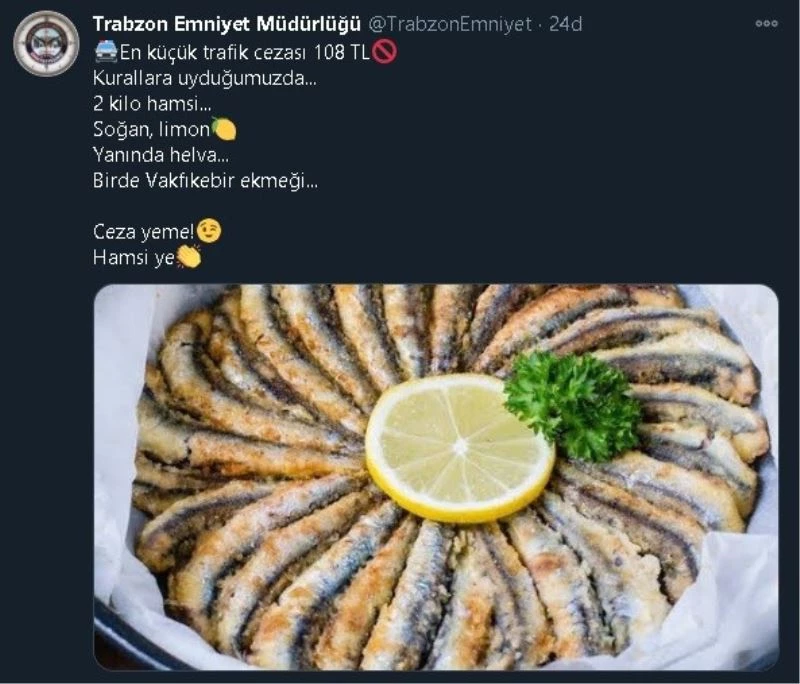 Trabzon Emniyet Müdürlüğü Sssyal medya hesabından ilginç bir paylaşım yaparak, sürücülere "Ceza yeme, hamsi ye" önerisinde bulundu.