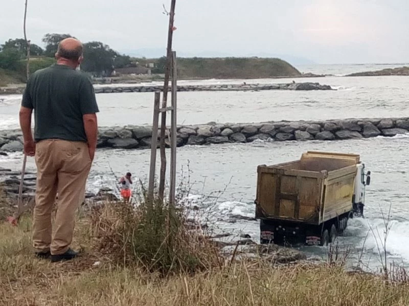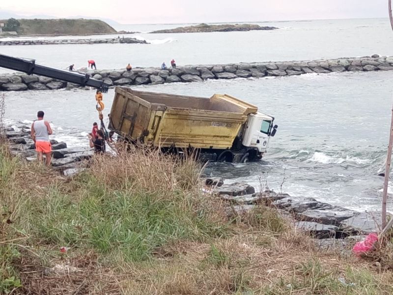 Trabzon’un Arsin ilçesinde denize uçan hafriyat kamyonu yoldan geçenlerin ilgisini çekerken, kayalıkların üzerindeki kamyonu bulunduğu yerden çıkarmak için uzun uğraş verildi.