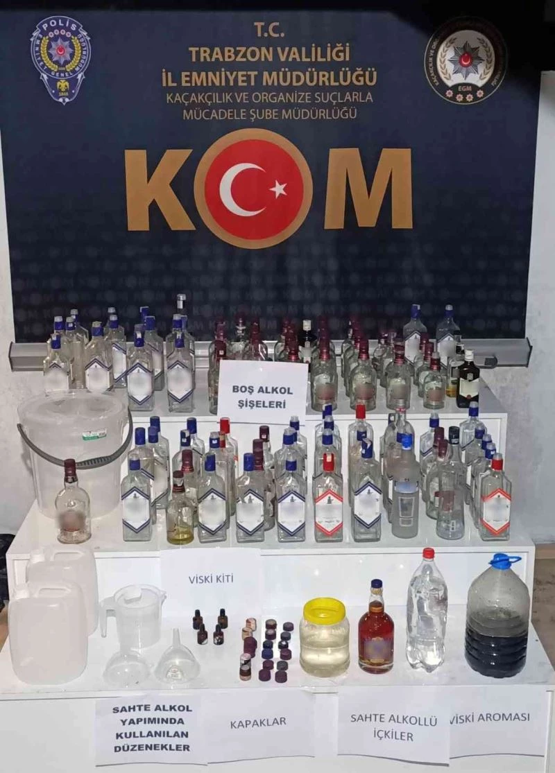 Edinilen bilgiye göre, Trabzon Emniyet Müdürlüğü Kaçakçılık ve Organize Suçlarla Mücadele Şube Müdürlüğü ekiplerince alkollü içki kaçakçılığı ve sahteciliğinin azaltılması, devletin vergi kaybının önlenmesi ve mücadelenin görünür kılınması amacıyla Z.G. isimli şahsa ait evde arama yapıldı. Yapılan aramada 92 adet içki imalatında kullanılan boş cam şişe, 2 adet 5 litrelik içki imalatında kullanılan boş etil alkol bidonu, 18 adet içki imalatında kullanılan şişe kapağı, 1 adet 2,5 lt’lik pet şişe içerisinde sahte olduğu değerlendirilen votka, 1 adet 2 lt’lik bidon içerisinde sahte olduğu değerlendirilen votka, 1 adet 20 lt’lik plastik boş kova, 1 adet maşrapa, 2 adet huni, 1 adet şişe içerisinde bandrolsüz yapma olduğu değerlendirilen viski, 1 adet 5 lt’lik bidon içerisinde içki imalatında kullanılan viski aroması olduğu değerlendirilen sıvı madde ve 4 adet cam şişe içerisinde içki imalatında kullanılan viski kiti ele geçirildi. Gözaltına alınan Z.G. isimli şahsın sorgusunun sürdüğü öğrenildi.