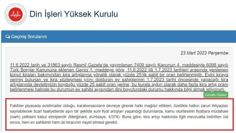 Trabzonlu kira artışı ile ilgili Din İşleri Yüksek Kurulu’na fetva başvurusunda bulundu, kurul cevabını siteden duyurdu