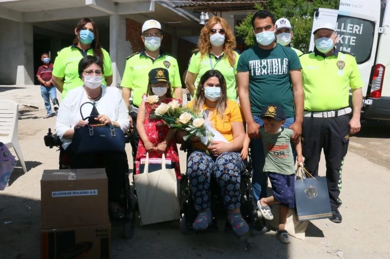 Manisa İl Emniyet Müdürü Ömer Uslusoy ve Trafikten Sorumlu İl Emniyet Müdür Yardımcısı İlker Çetinkaya ile birlikte trafik polisleri Trafik Haftası etkinlikleri kapsamında geçirdiği trafik kazası sonrası tekerlekli sandalyeye mahkum olan 2 çocuk annesi engelli kadını ziyaret etti. Ziyarette Uslusoy ve Çetinkaya engelli anne Seda Merter’e akülü tekerlekli sandalye hediye etti.