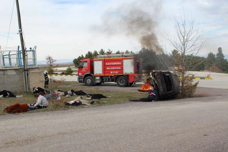 Kastamonu’da UMKE, AFAD ve itfaiye ekiplerinin ortak düzenlediği trafik kazası tatbikatı adeta nefes kesti. Senaryo gereği 22 yaralı kurtarılırken, bu sırada yoldan geçen vatandaşlar ise araçlarını durdurarak ne olup bittiğini anlamaya çalıştı.
