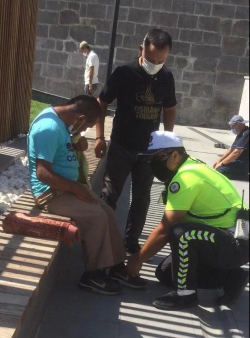 Tarihi Kayseri Kalesi içinde bulunan Fatih Sultan Mehmet Camii’nde Cuma namazını kılan engelli vatandaşa trafik polisinin yardım etmesi vatandaşlar tarafından görüntülendi. Namazını kılan engelli vatandaş ayakkabısını giymekte zorlanınca yardımına polis memuru yetişti. Dizlerinin üstüne çöken polis memuru engelli vatandaşın ayakkabısını giymesine yardımcı oldu ve bağcıklarını bağladı.
