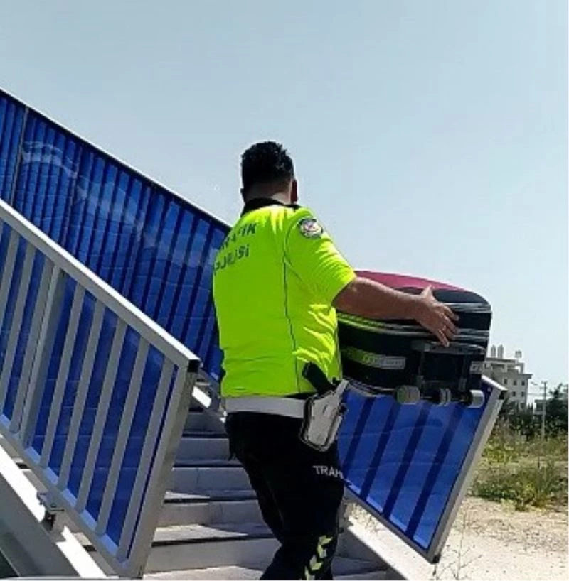 Adıyaman’da, ağır olan valizini üst geçitten çıkaramayan vatandaşın yardımına trafik polis memuru yetişti.