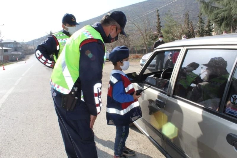 Eğitim sonunda öğrencilere bilgilendirici el broşürleri dağıtan jandarma çocuklarla birlikte araç denetimine katıldı. Jandarma kıyafeti giyen çocuklar ellerindeki telsizlerle beraber sürücüleri durdurarak ehliyet ve ruhsat sorgusu yaptı.