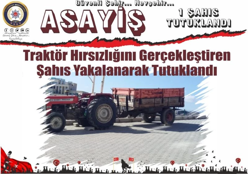 Nevşehir’de Cevher Dudayev Mahallesinde bir ikametin önünde park halinde bulunan 50 plakalı traktör ve arkasında takılı iki tekerlekli römork çalındı. Nevşehir İl Emniyet Müdürlüğü Asayiş Şube Müdürlüğü Hırsızlık Oto Hırsızlık Büro Amirliği ekipleri tarafından yapılan teknik çalışmalar ve araştırmalar neticesinde olayı gerçekleştiren şahsın R.S. olduğu tespit edildi. Kısa sürede yakalanan şahıs emniyetteki işlemlerinin ardından sevk edildiği adli makamlarca tutuklandı. Polis ekipleri, traktör ve römorkunun bulunmasına yönelik çalışmalarına devam ediyor.