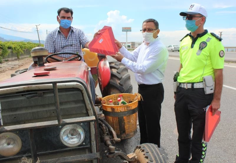 Manisa’nın Alaşehir ilçesinde traktör sürücülerinin yoğun olarak kullandığı Akkeçili yolunda uygulama yapan ekipler hem sürücüleri bilgilendirdi hem de reflektör dağıtımı gerçekleştirdi. Ekiplere Alaşehir Kaymakamı Abdullah Uçgun da eşlik etti.