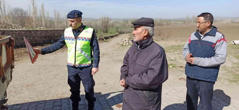 İl Jandarma Komutanlığı trafik ekipleri çiftçilere, traktör kazalarını önlemeye yönelik alınacak tedbirler ile bu tedbirler doğrultusunda görünürlüğü arttıran reflektör ve sürücünün devrilen traktörün altında kalmasını engelleyen ROPS (koruma çerçevesi) demirinin önemini anlattı.
