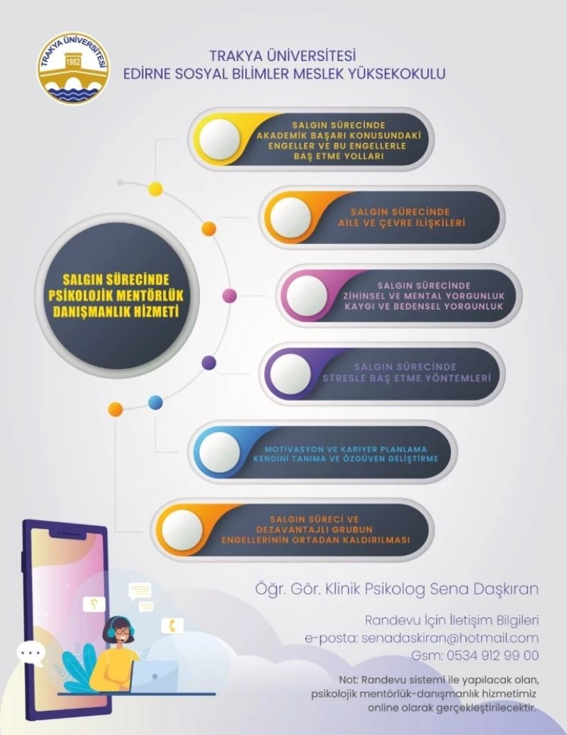 E-posta ve cep telefonu üzerinden randevu sistemi ile gerçekleştirilecek psikolojik mentörlük ve danışmanlık hizmetinde öğrencilere, Edirne Sosyal Bilimler Meslek Yüksekokulu Sosyal Hizmetler ve Danışmanlık Bölümü Öğr. Gör. Sena Daşkıran destek olacak. Salgın sürecinde stres, korku, kaygı bozukluğu ve uyum sorunu yaşayan öğrencilerle dayanışma içerisinde olacak Klinik Psikolog Öğr. Gör. Sena Daşkıran kişisel gelişim, akademik başarı, motivasyon ve kariyer planlaması konularında da öğrencilere rehberlik edecek.