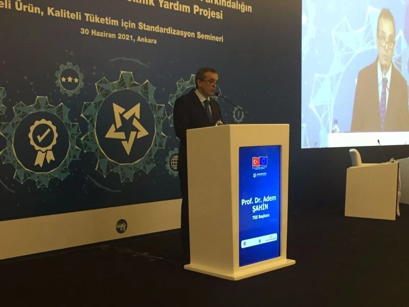 Standardizasyon Sisteminin Geliştirilmesi ve Farkındalığın Artırılmasına Yönelik Teknik Yardım Projesi kapsamında Ankara’da bir otelde düzenlenen etkinlikte konuşan TSE Başkanı Adem Şahin, “ Avrupa Birliği (AB) ve Ülkemizin ortak finansmanıyla yürütmekte olduğumuz ‘Standardizasyon Sisteminin Geliştirilmesi ve Farkındalığın Artırılmasına Yönelik Teknik Yardım Projesi’ kapsamında, tüketicilere yönelik çevrim içi düzenlenen ‘Kaliteli Ürün, Kaliteli Tüketim için Standardizasyon’ seminerimize mensubu bulunduğum Türk Standartları Enstitüsü (TSE) ailesi adına hoş geldiniz diyorum. Enstitümüz, 67 yıldır Ülkemizin rekabet gücünü artırırken, ulusal ve uluslararası düzeyde ticaretini kolaylaştırmaktadır. Toplumumuzun yaşam düzeyini yükseltmek amacıyla standardizasyon ve uygunluk değerlendirme faaliyetlerini tarafsız, bağımsız, etkin ve güvenilir bir şekilde sürdürmektedir.