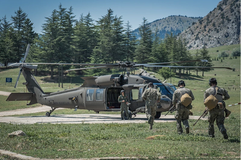 Keskin nişancılar, eğitim faaliyetleri kapsamında hedeflere belirlenen süre içerisinde helikopterden başarılı atışlar yaptı. Sabit olmayan alanda hedefleri tam isabetle vuran keskin nişancılar, görevlerini tamamladıktan sonra yere indi.