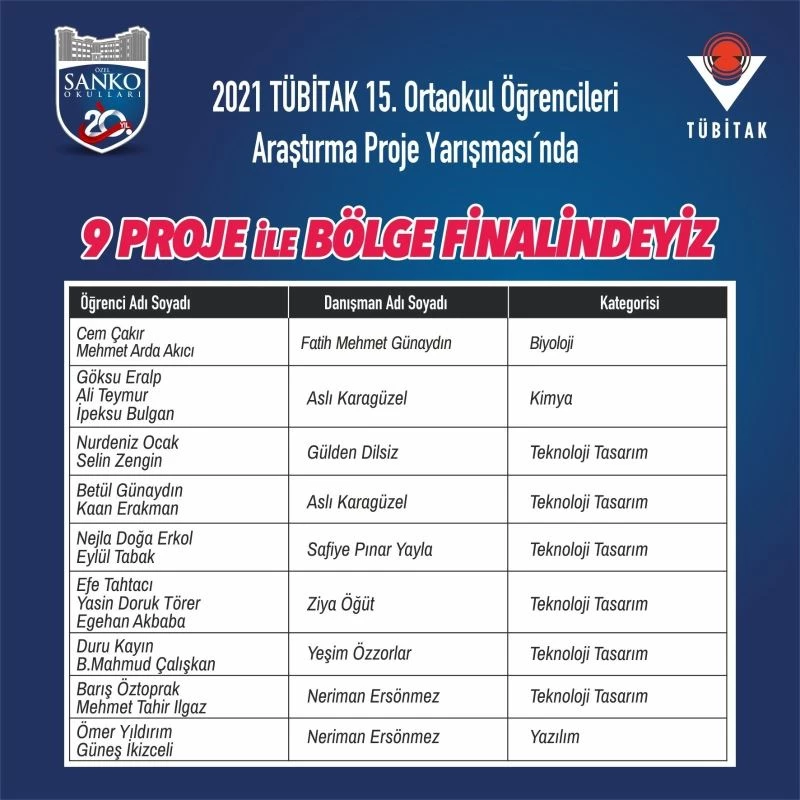 SANKO Okulları öğrencilerinin dokuz projesi, “TÜBİTAK 15. Ortaokul Öğrencileri Araştırma Projeleri Yarışması”nda il elemelerini geçerek, bölge yarışmalarına katılma hakkı kazandı.