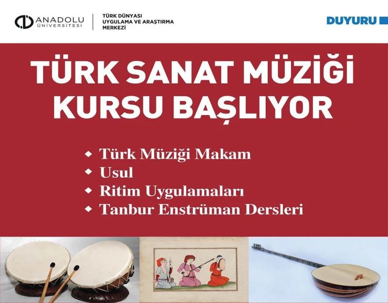 Anadolu Üniversitesi Türk Dünyası Uygulama ve Araştırma Merkezi Müdürlüğü (TÜDAM) tarafından Türk Sanat Müziğine ilgi duyan kişiler için Türk Sanat Müziği Kursu açılacak.