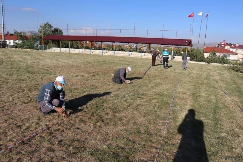Tufanbeyli ilçesindeki namaz kılınacak cami ve bahçelerinde dezenfektan işlemi yapılırken, güreş sahasında kılınacak cuma namazı öncesi sosyal mesafe kurallarına uyulması için sprey boya ile namaza durulacak yerleri belirledi.