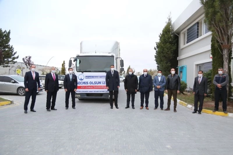 Depremden etkilenen vatandaşlar için 1. OSB yönetimi tarafından başlatılan yardım kampanyası kapsamında toplanan 390 gıda kolisinin yüklendiği yardım tırı dualarla uğurlandı.