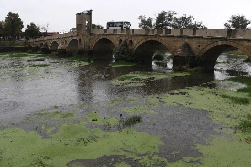 Edirne’de, üzerindeki tarihi taş köprü gerdanlıkları ile kente eşsiz güzellikler katan nehirlerden olan Tunca Nehri, bu kez görüntüsü ile endişe veriyor.