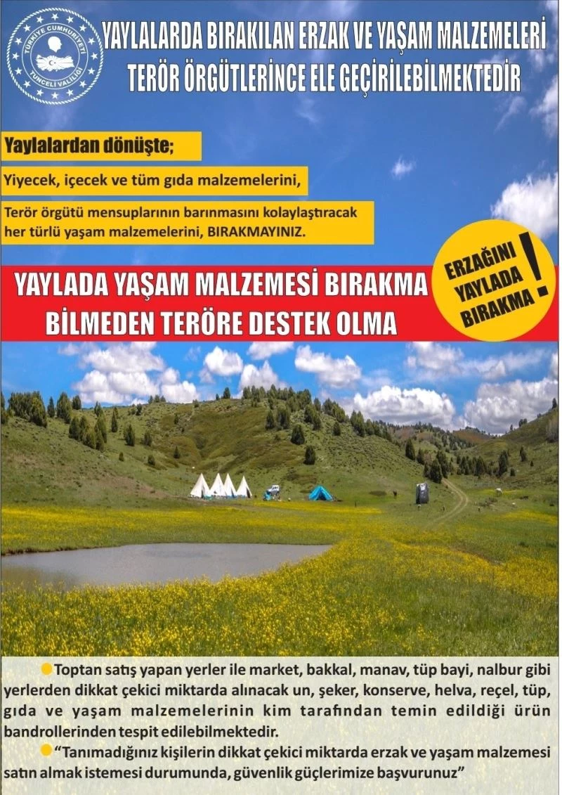 Tunceli Valiliği, yaylalara çıkan vatandaşlara ‘Yaylada yaşam malzemesi bırakma, bilmeden teröre destek olma’ çağrısında bulundu.