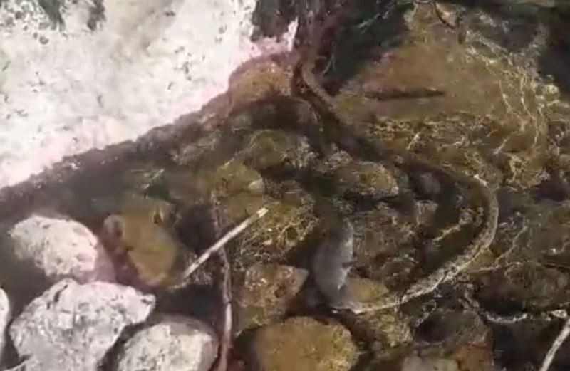 Ovacık ilçesinde bulunan Munzur Gözeleri’nde endemik bir tür olduğu için koruma altında bulunan kırmızı pullu alabalıkları bir yılan avladı. O anları gören Alper Gedik, cep telefonu kamerasıyla görüntülendi.