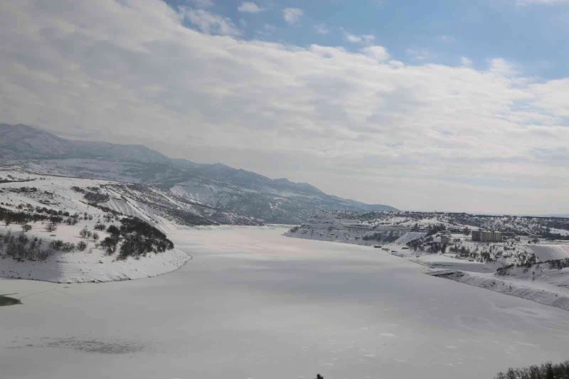 Tunceli’de etkisini gösteren soğuk hava Uzunçayır Baraj Gölü’nün büyük bölümünün donmasına neden oldu.