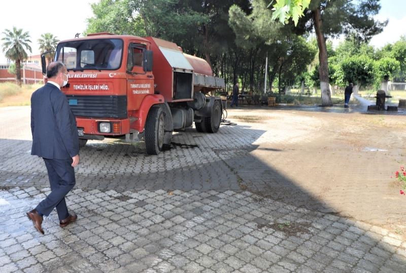 Turgutlu Belediyesi cami ve okul bahçelerini dezenfekte ediyor