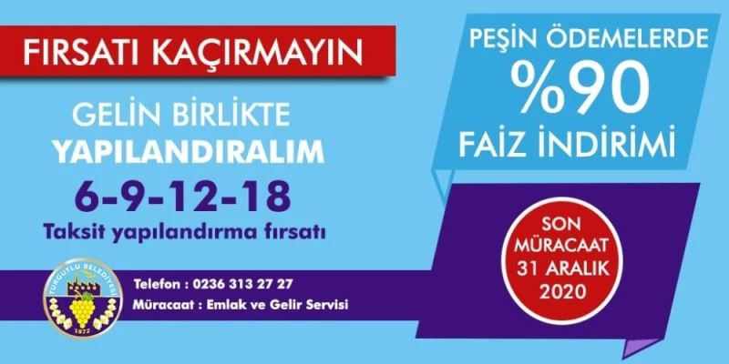 Resmi Gazete’de yayımlanan ‘Bazı Alacakların Yeniden Yapılandırılması ile Bazı Kanunlarda Değişiklik Yapılması Hakkındaki Kanun’una göre Emlak ve Çevre Temizlik Vergi borçları da yapılandırma kapsamına alındı. Turgutlu Belediyesi de sunduğu hizmetle vergi borçlarını yapılandırıyor. Vergi borçlarını yapılandırmak isteyen Turgutlulular, peşin ödemelerde yüzde 90 faiz indiriminin yanı sıra 6, 9, 12 ve 18 taksitte yapılandırma fırsatından yararlanabilecek.