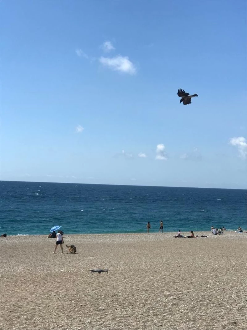 Öte yandan, Konyaaltı Sahili'nde drone ile çekim yapan basın mensuplarına kargalar zor anlar yaşattı. Kargaların, droneyi uzaklaştırmaya çalışması gülümsetti.