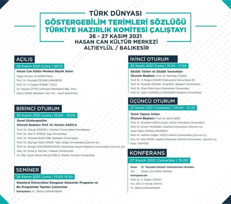 Anadolu Semiyotik Araştırmaları Derneği (ANASEM) Türkiye Göstergebilim Çevresi (TGÇ) Altıeylül Belediyesi ve Altıeylül Kent Konseyi işbirliğiyle düzenlenen Türk Dünyası Göstergebilim Terimleri Sözlüğü Türkiye Hazırlık Komitesi Cuma günü Balıkesir’de Altıeylül Hasan Can Kültür Merkezi’nde toplanıyor. Türkiye’den ve KKTC’den, 19 üniversiteden göstergebilim alanında çalışmalar yapan bilim insanları iki günlük bir çalıştay için, 26 Kasım 2021 Cuma günü Balıkesir’de bir araya geliyor.