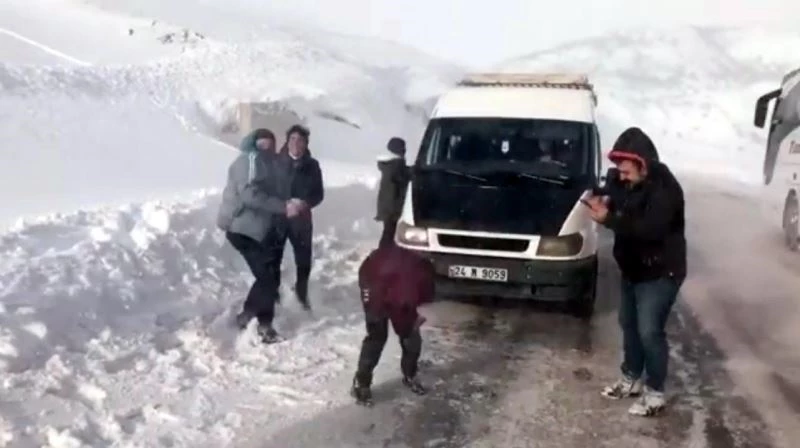 Türk halk müziği sanatçısı Erdal Erzincan, kar ve tipinin etkili olduğu yolda ekibiyle birlikte duraksayarak kartopu oynadı.