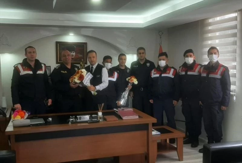 İlçe Jandarma personeli de İlçe Emniyet Müdürlüğü'nde tüm odaları gezerek, çiçek verdi.