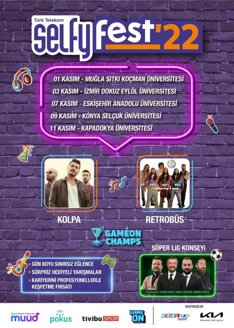 Türk Telekom’un gençlik markası Selfy, 1-11 Kasım tarihleri arasında; Muğla, İzmir, Eskişehir, Konya ve Kapadokya’da ‘Selfy Kampüste’ konseptiyle üniversite öğrencileriyle buluşacak. Selfy, program kapsamında toplam 5 kampüste 300 bine yakın öğrenciye festival coşkusu yaşatacak.