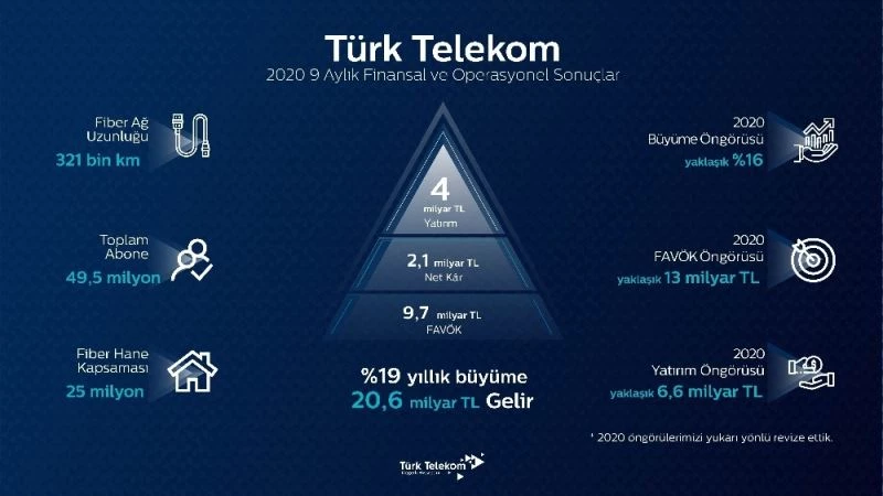 Önal, “2020’nin 3. çeyrek performansını başarıyla geride bıraktık. Üçüncü çeyrekte de çekirdek şebekemiz üzerine yüklenen ilave yoğun trafikle artan iletişim talebinin üstesinden gelerek kesintisiz iletişimi devam ettirdik. Ülkenin her bir köşesine ulaşan güçlü fiber ağımızı 321 bin kilometre uzunluğa çıkardık. Fiberdeki lider pozisyonumuzu 5G ve dijital teknolojilere aktararak bu yolculukta Türkiye’yi öncü yapmaya kararlıyız” diye ifade etti.