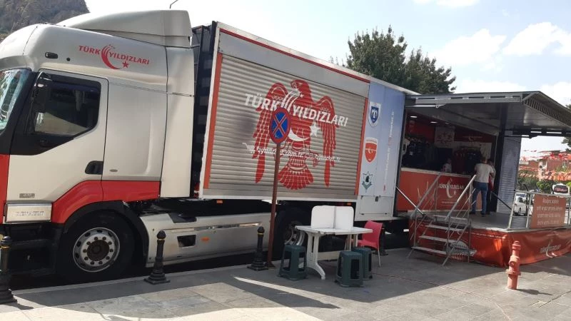 Afyonkarahisar’da nefes kesen gösteriler gerçekleştiren Türk Yıldızları Akrobasi Ekibi’nin faaliyetlerine ilişkin tanıtım ve lisanslı ürünlerinin satışının yapıldığı Türk Yıldızları ürün satış aracı, Zafer Kent Meydanı’nda stant açtı.