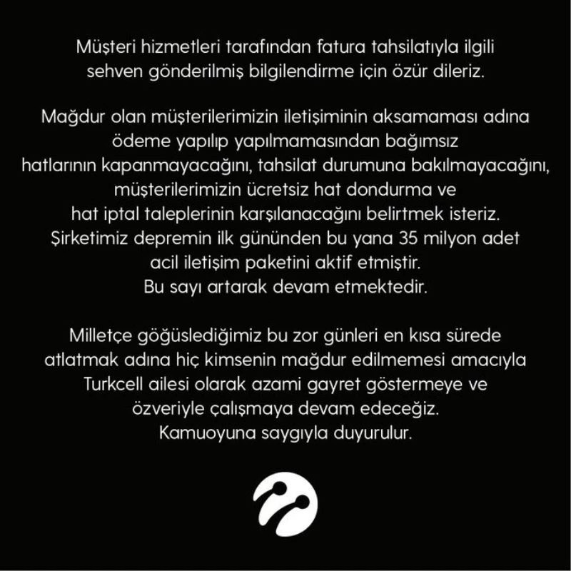 Mağdur olan müşterilerimizin iletişiminin aksamaması adına ödeme yapılıp yapılmamasından bağımsız olarak hatlarının kapanmayacağını, tahsilat durumuna bakılmayacağını, müşterilerimizin ücretsiz hat dondurma ve hat iptal taleplerinin karşılanacağını belirtmek isteriz. Şirketimiz depremin ilk gününden bu yana 35 milyon adet acil iletişim paketini aktif etmiştir. Bu sayı artarak devam etmektedir.
