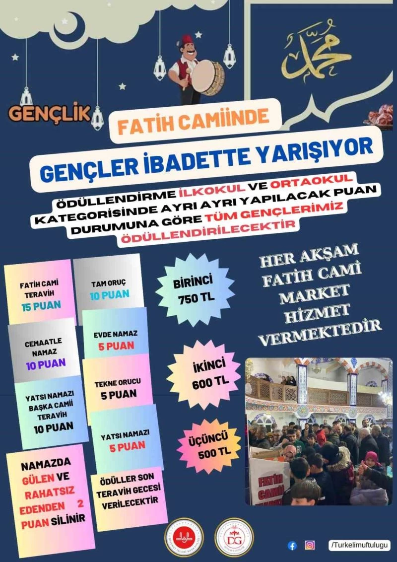 Oruç, cemaatle namaz, teravih namazı gibi ibadetlerin puanlanacağı yarışmada, yarışmanın birincisine 750 lira, ikincisine 600 lira ve üçüncüsüne 500 lira ödüllendirileceği belirtilirken, ayrıca yarışmaya tüm gençlere de hediyeler verilecek.
