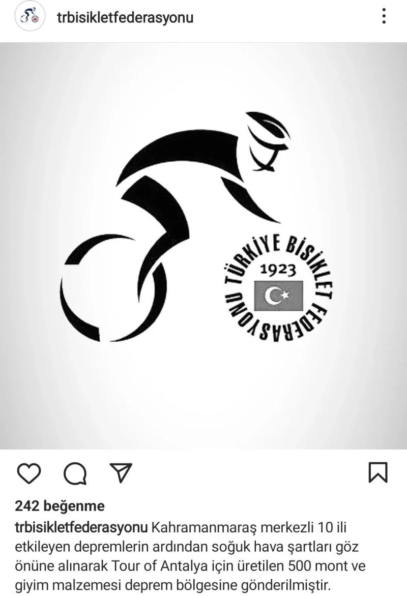 Türkiye Bisiklet Federasyonu ayrıca depremzedeler için nakdi para yardımının yanında 500 mont gönderdiğini duyurdu. Konuyla ilgili yapılan paylaşımda, "Kahramanmaraş merkezli 10 ili etkileyen depremlerin ardından soğuk hava şartları göz önüne alınarak Tour of Antalya için üretilen 500 mont ve giyim malzemesi deprem bölgesine gönderilmiştir" denildi.