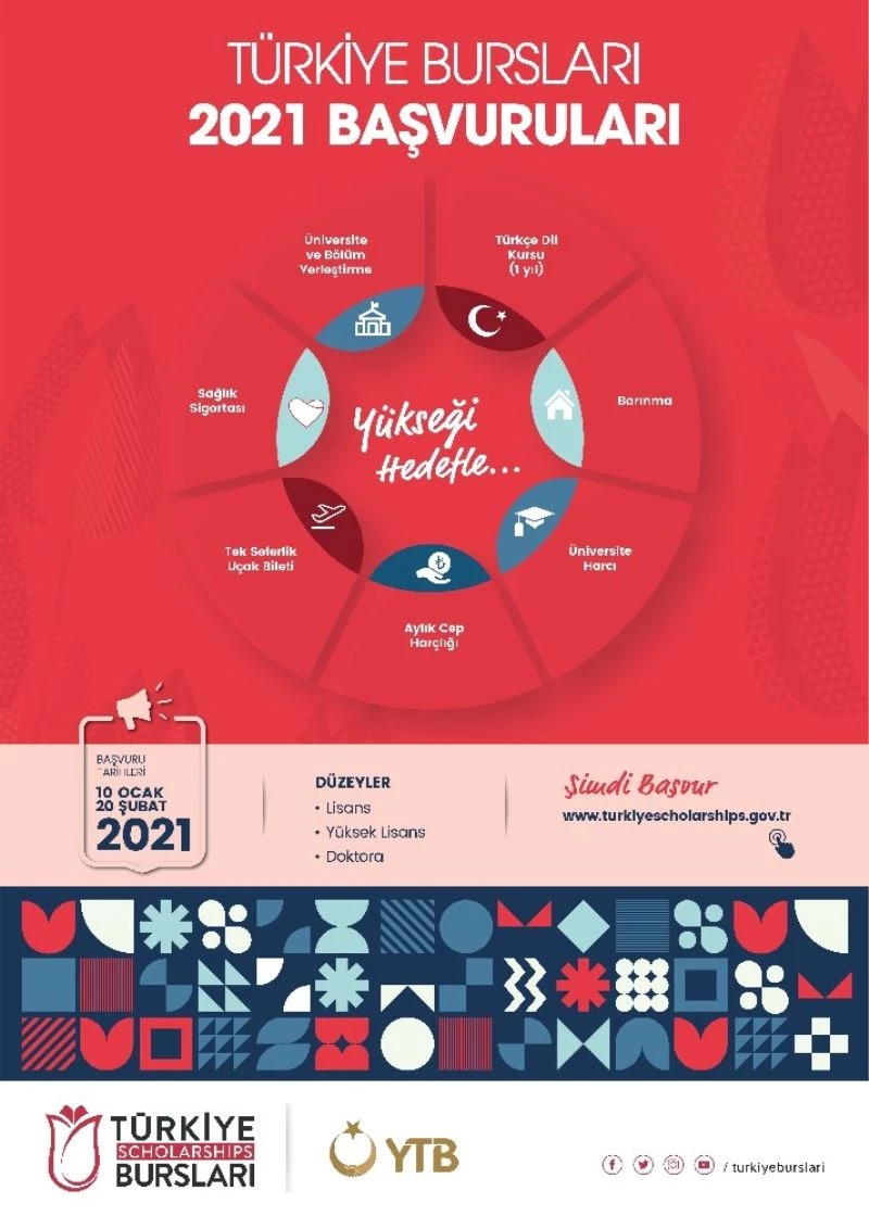 Dünyanın bütün ülkelerine açık olan Türkiye Bursları 2021 yılı başvuruları ise 10 Ocak - 20 Şubat 2021 tarihleri arasında alınacak. Başvurular; Lisans, Yüksek Lisans ve Doktora düzeyinde eğitim almak isteyen adaylara açık olacak.