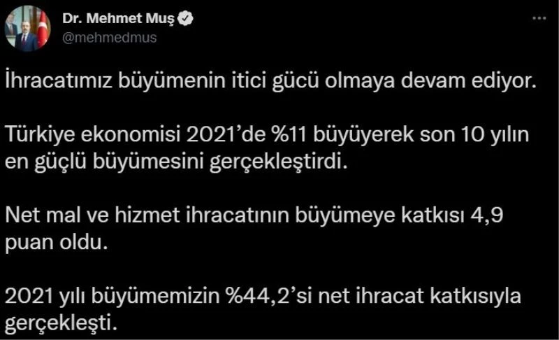 Ticaret Bakanı Mehmet Muş, sosyal medya paylaşımında, “İhracatımız büyümenin itici gücü olmaya devam ediyor. Türkiye ekonomisi 2021’de yüzde 11 büyüyerek son 10 yılın en güçlü büyümesini gerçekleştirdi. Net mal ve hizmet ihracatının büyümeye katkısı 4,9 puan oldu. 2021 yılı büyümemizin yüzde 44,2’si net ihracat katkısıyla gerçekleşti" dedi.