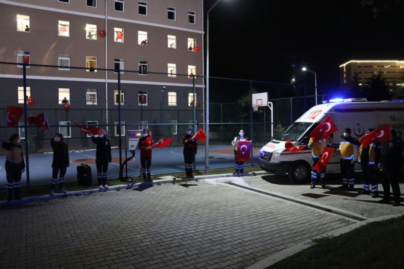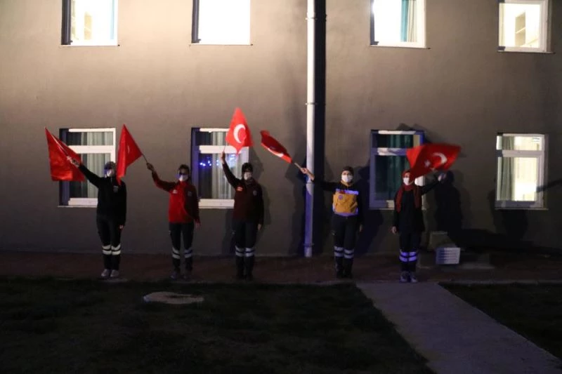 Yurdun bahçesinde hazir bekletilen 112 Acil Servis ekipleri, ambulanslarin sirenlerini açarak ellerindeki Türk bayraklariyla "Ölürüm Türkiye'm" sarkisina eslik etti.