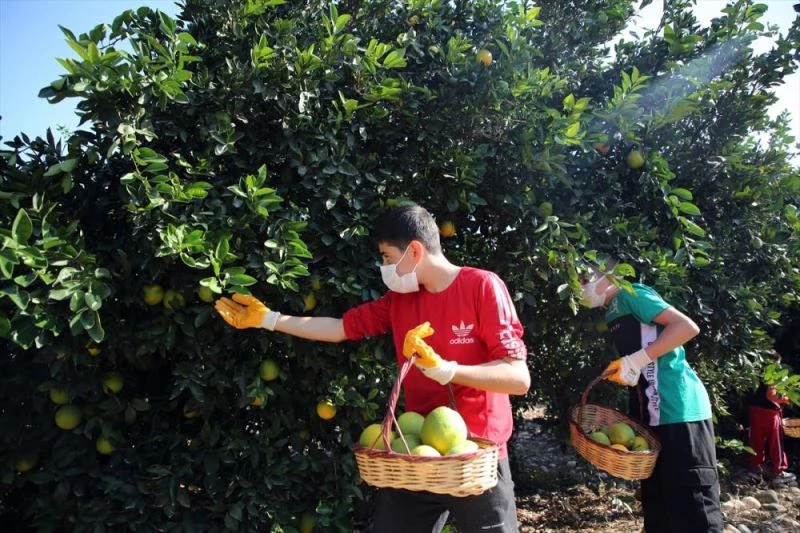 Akdeniz Belediyesince Karacailyas Mahallesi'ndeki düzenlenen etkinlikte bir araya gelen çocuklar buradaki bahçelerden narenciye topladi.
