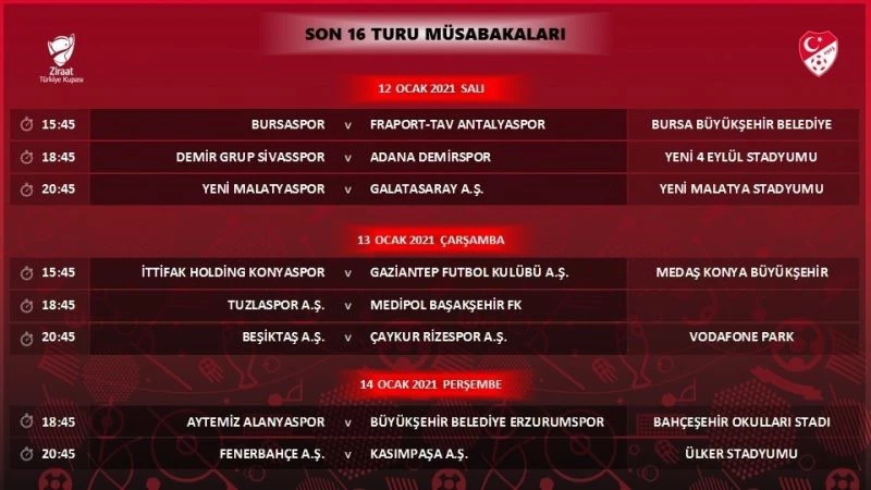 Ziraat Türkiye Kupası Son 16 Turu’nda oynanacak maçların planlaması duyuruldu. TFF’nin resmi sitesinden açıklanan 12, 13 ve 14 Ocak 2021 tarihlerinde oynanacak müsabakaların programı şöyle: