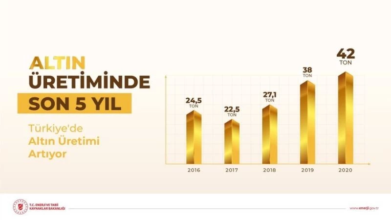 Türkiye’de altın üretimi artıyor. Enerji ve Tabii Kaynaklar Bakanlığı, sosyal medya hesabından Türkiye’nin altın üretiminin son 5 yılına ait tablo yayımladı. Tabloya göre, Türkiye’nin altın üretimi 2016’da 24,5 ton, 2017’de 22,5 ton, 2018’de 27,1 ton, 2019’da 38 ton gerçekleşirken, 2020 yılında ise 42 ton olarak kaydedildi.